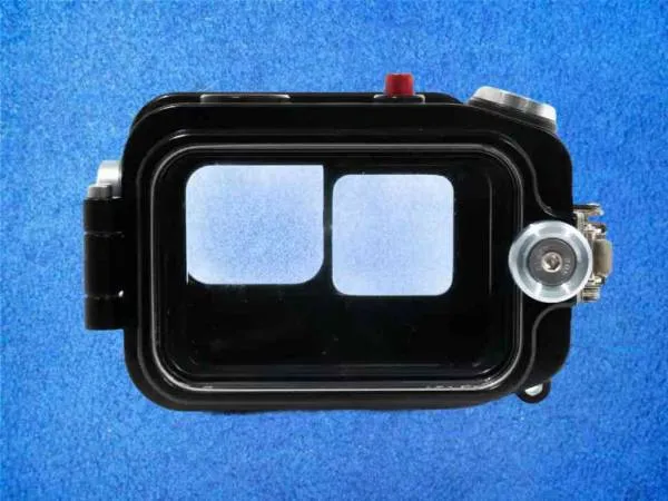 In der Front des Unterwassergehäuse befindet sich drei Gewindesacklöcher um die Flip-Halterung oder den Filter Adapter zu montieren für Zubehör wie Rot- und Magenta-Filter oder Macrolinse.