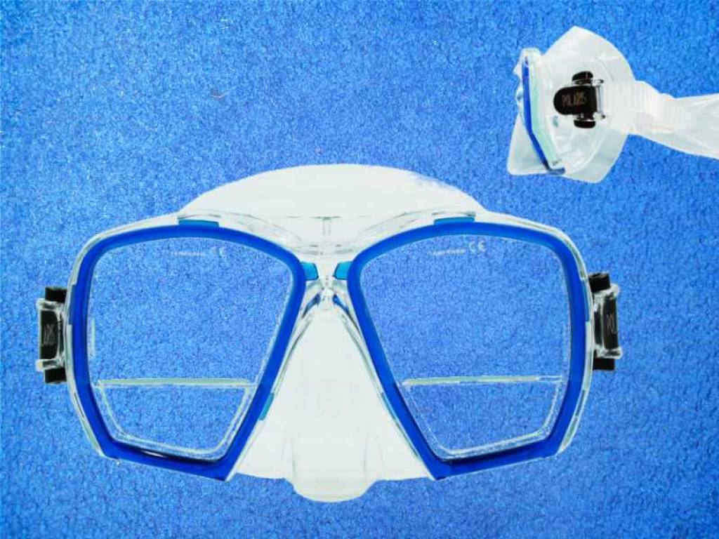 Taucherbrille mit Sehstärke mit eingebauten im unteren Bereich leicht abgewickelte optischen Gläser +1,75 Dioptrien.
