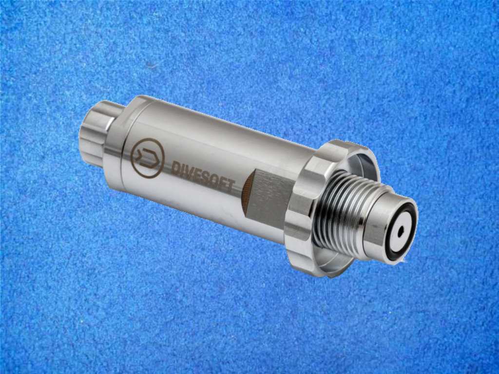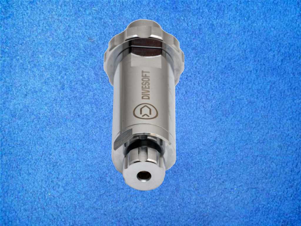 der "Neue" Divesoft Professional Flow Limiter Mk2 mit Gewinde DIN - G 5/8" für 200 und 300bar sowie Entlüftung.